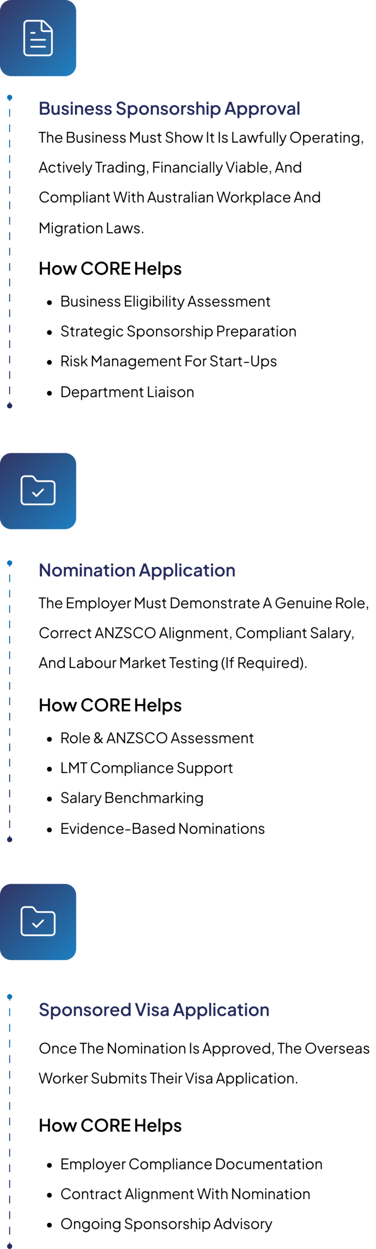 At Core Immigration, we act as a compliance focused migration partner for Australian employers, assisting businesses to sponsor skilled workers lawfully, efficiently, and with risk mitigation in mind including newly established and growing businesses.